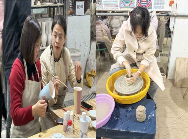 参观结束后,师生跟随非遗中心工作人员学习制陶技艺,体验陶瓷制作的乐趣。拉坯的微妙手感、修坯的细致入微、描绘的淡雅韵味,每一道工序都让师生们深刻感受到了非遗技艺的独特魅力。