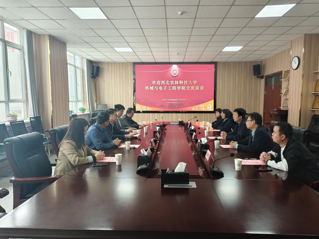 4月20日,西北农林科技大学机械与电子工程jrs看球 党委书记王雄、副院长苏宝峰等来院座谈交流,我校党委教师工作部(人事处)副部长(副处长)张爱国(援疆),食品jrs看球 党委委员、副院长任亚梅(援疆)参加。座谈会由jrs足球直播 党委书记汤骅教授主持。